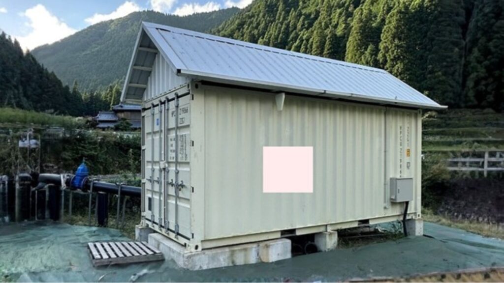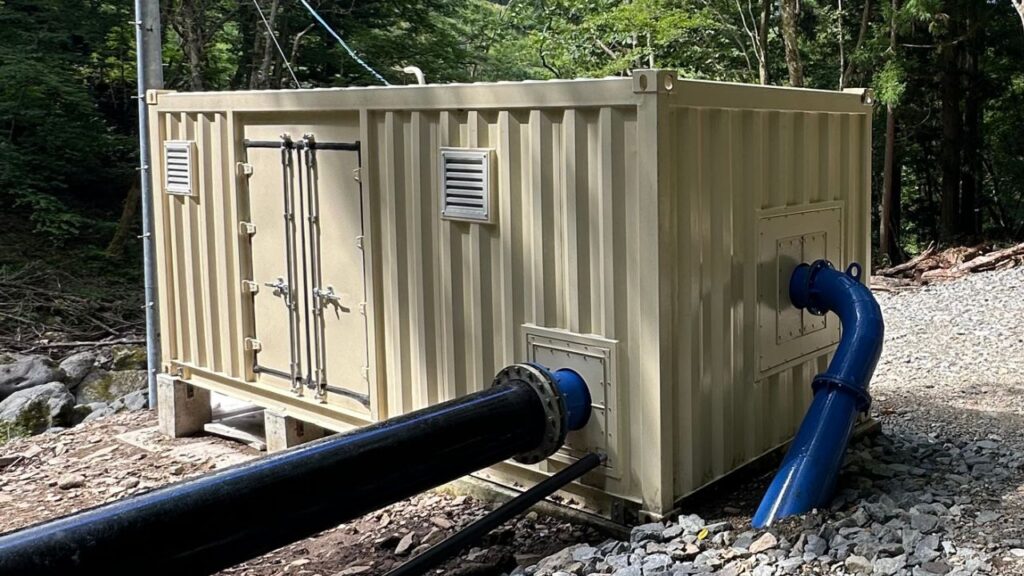 2.5m×奥行6.0mでいわゆる20フィートの海洋コンテナ 程の大きさで、その中に水車・発電機・パワ